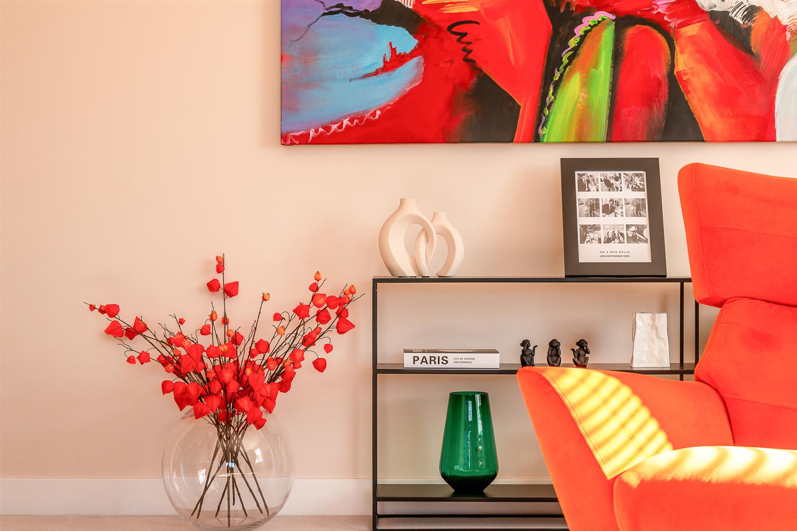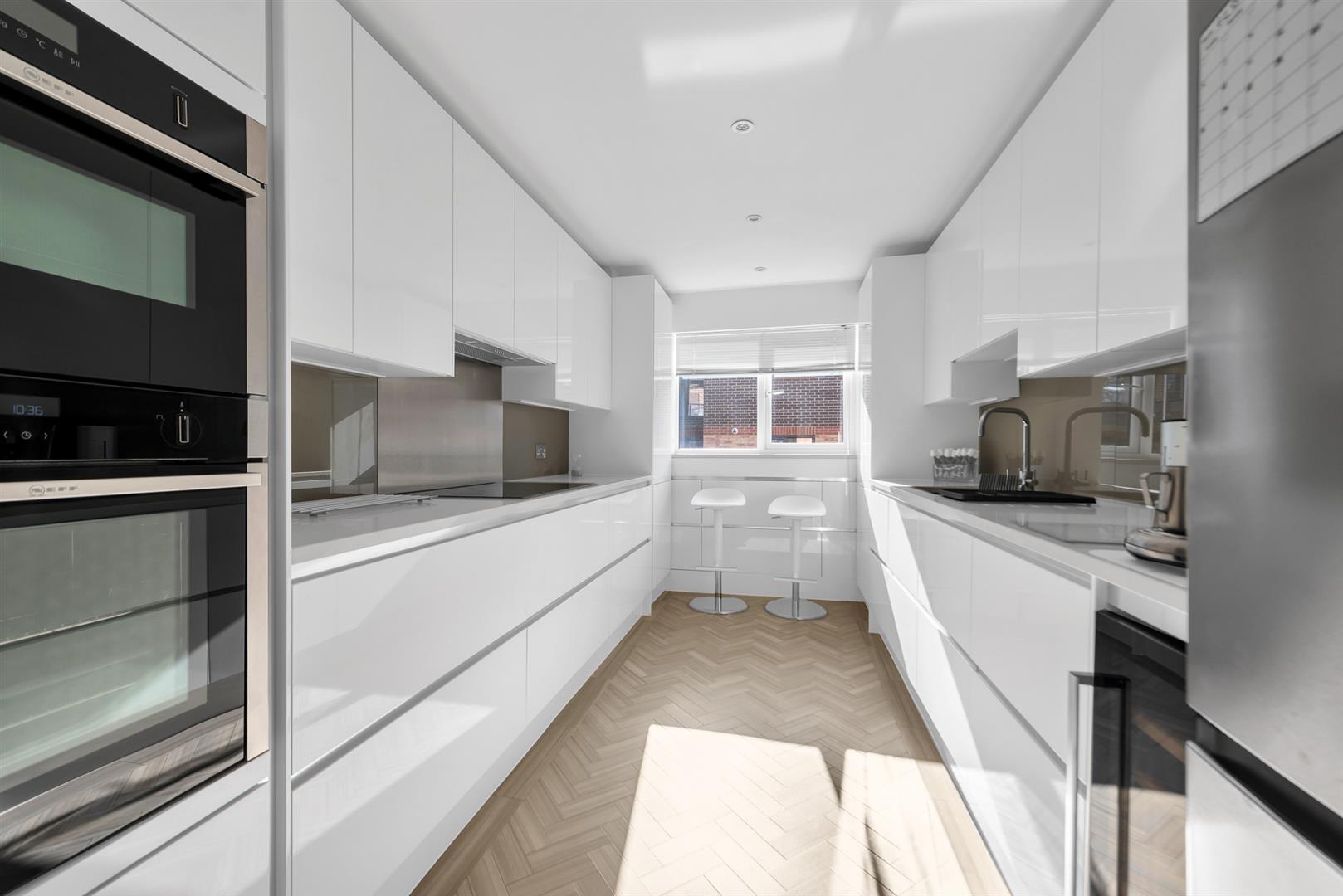 Window to side, fitted with a range of modern and stylishly appointed white gloss units with stone worktops to two walls; custom fitted fold out breakfast bar; inset sink unit; built-in double oven/microwave; electric hob with extractor hood; wine chiller; wood effect herringbone Amtico flooring; bespoke glass splashbacks.BEDROOM 1 5.82m x 3.07m (max) (19'1 x 10'1 (max) )