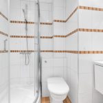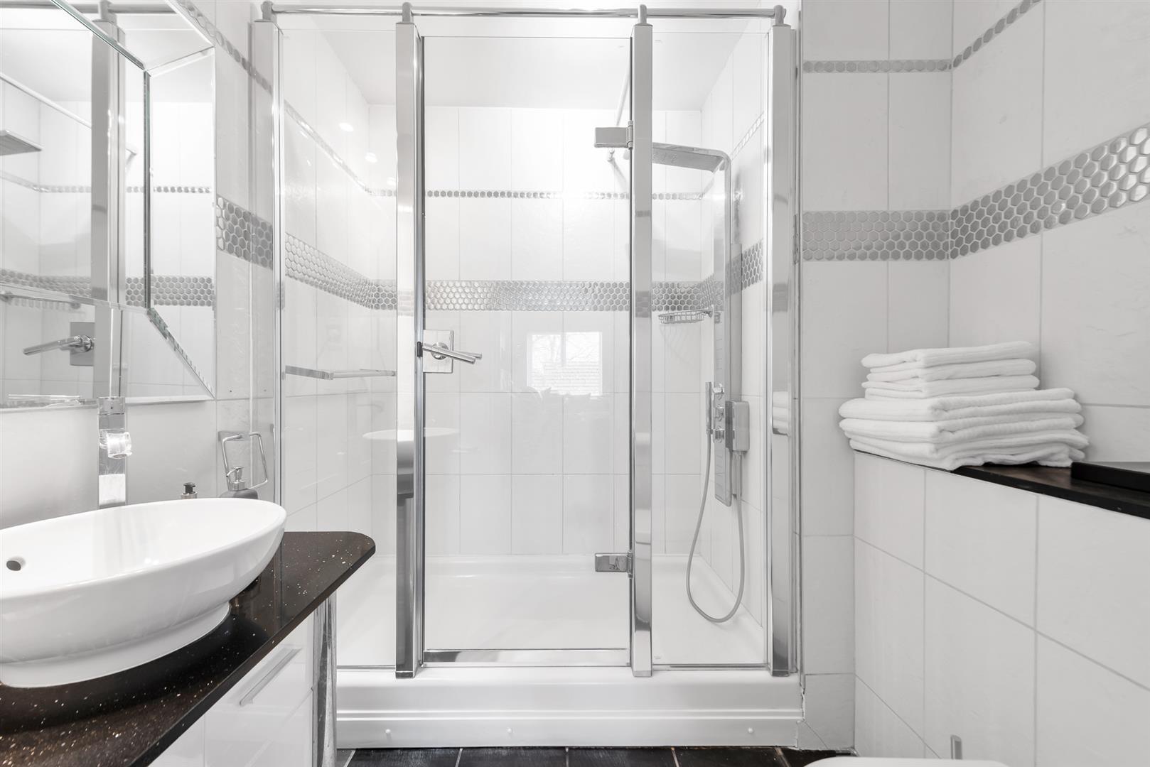 Suite comprising fitted corner shower cubicle, wash basin with integrated storage unit under, WC, fully tiled walls and flooring, heated towel rail, extractor fan.BATHROOM