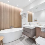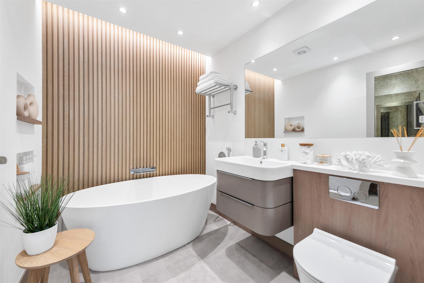 A luxuriously appointed suite featuring large oval bath with wall mounted waterfall tap over and separate shower hose; fitted wash basin/vanity storage under; WC; feature wood panelled wall; recessed display shelving; tiled flooring.GARDENS
