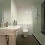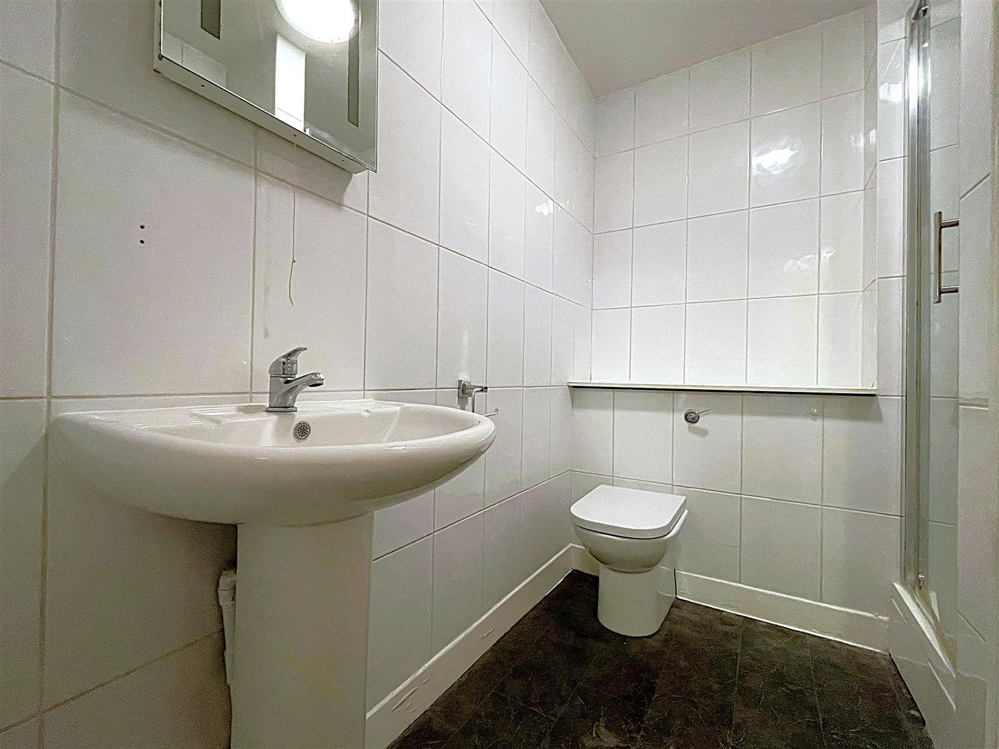 Modern suite comprising built-in shower cubicle; pedestal wash basin; WC; fully tiled walls; radiator; extractor fan.PARKING