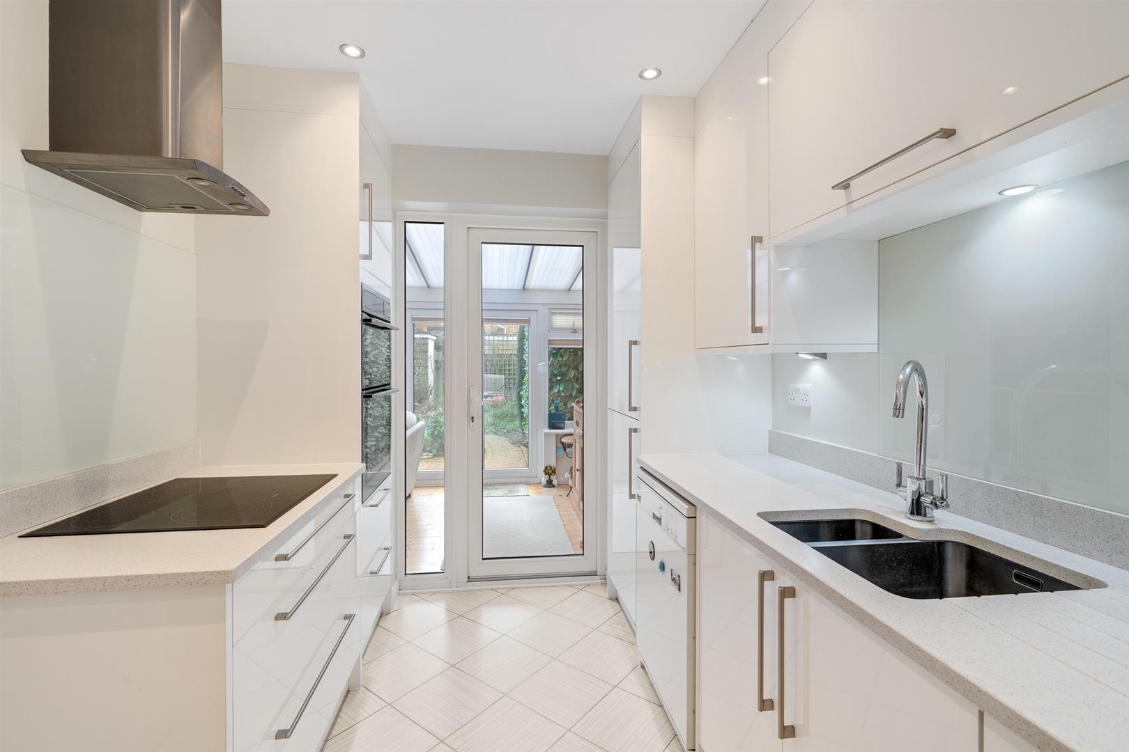 Double glazed door to rear leading to conservatory; kitchen fitted with a comprehensive range of modern white gloss units with stone worktops to three wall; range of integrated appliances plus Miele dishwasher to remain; tiled flooring.CONSERVATORY