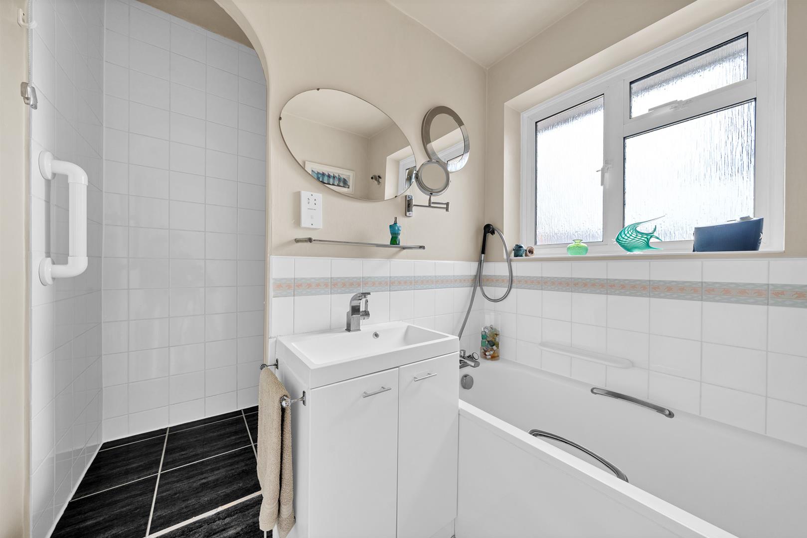 Double glazed window to side; suite comprising bath; separate walk-in shower with wall mounted rain shower head; wash basin with storage unit under; part tiled walls; radiator.SEPARATE WC