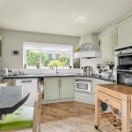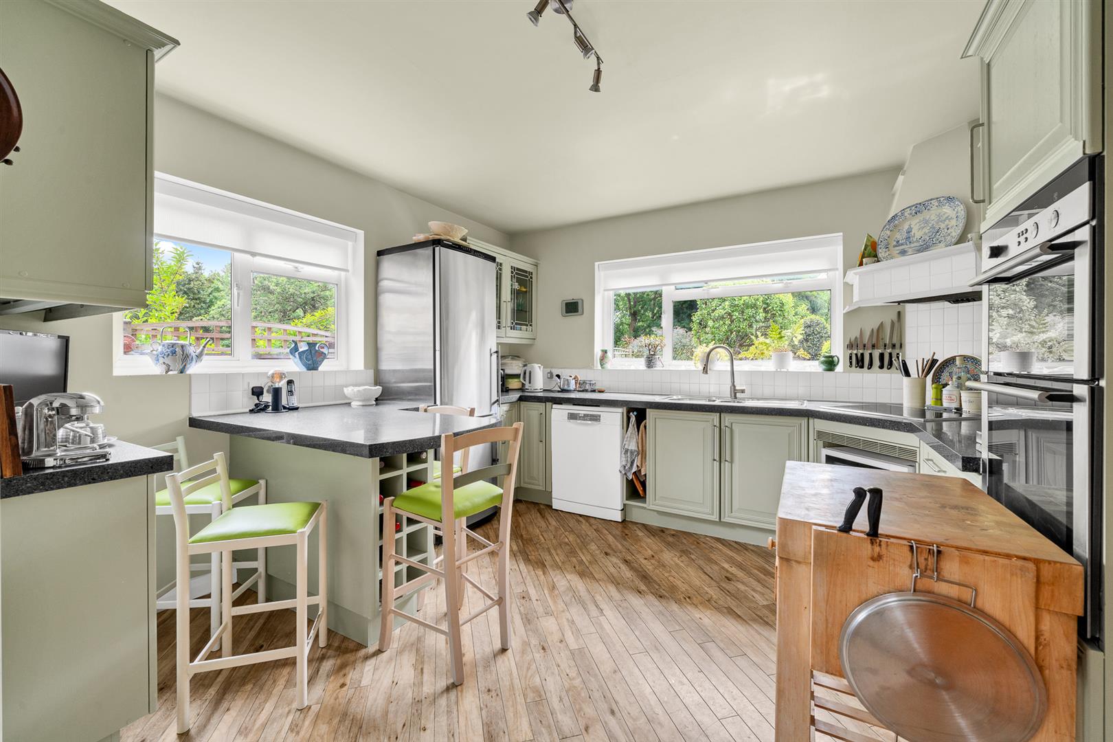 A triple aspect room featuring a comprehensive range of wall and base units and worktops to two walls; return breakfast bar; built-in oven and hob; Amtico wood effect flooring; radiator; useful original built-in shelved larder cupboard. Door to:OUTISDE COVERED SCULLERY