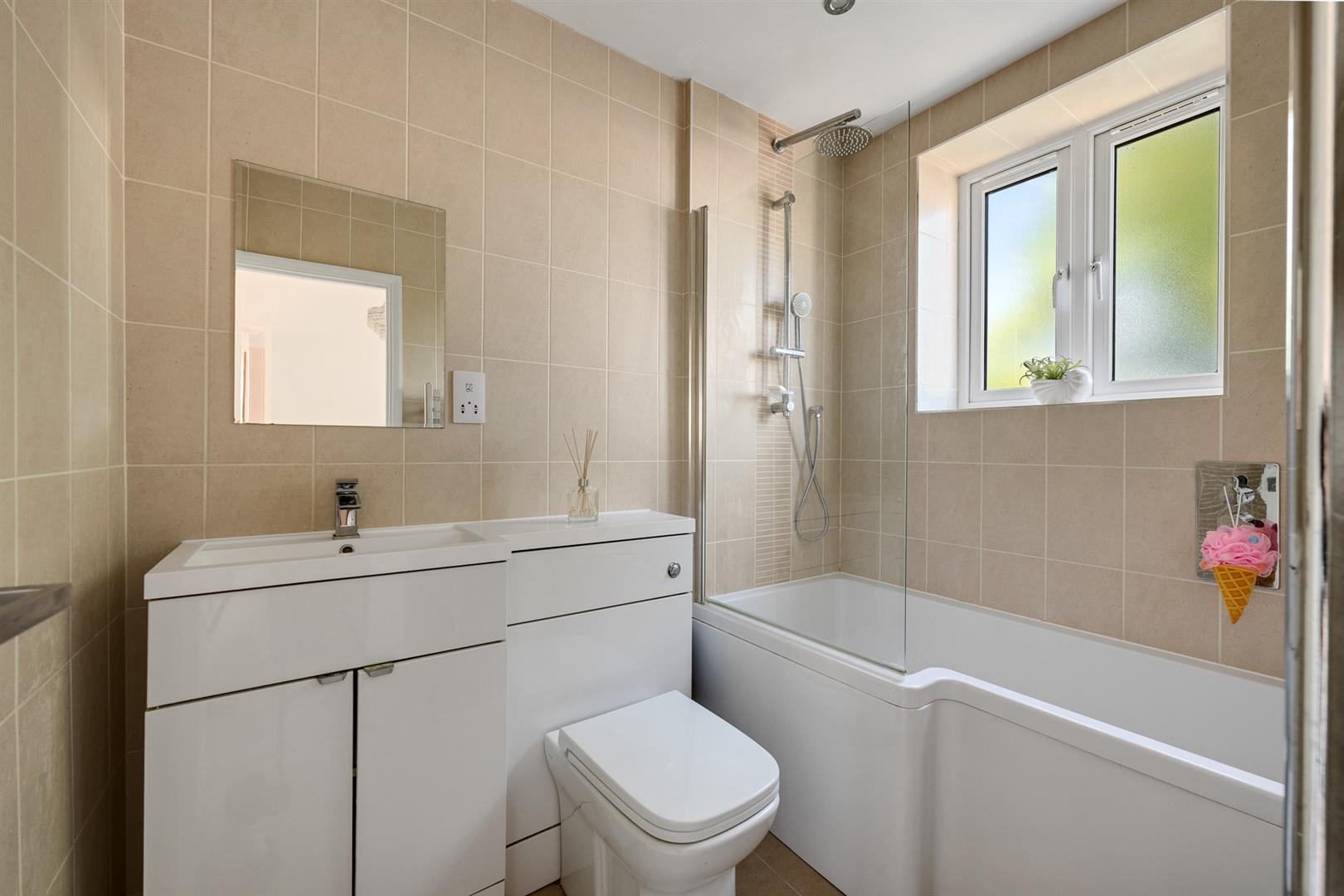 Fully tiled walls and floor, bath with shower over and screen, wash hand basin and w/c.GARDEN