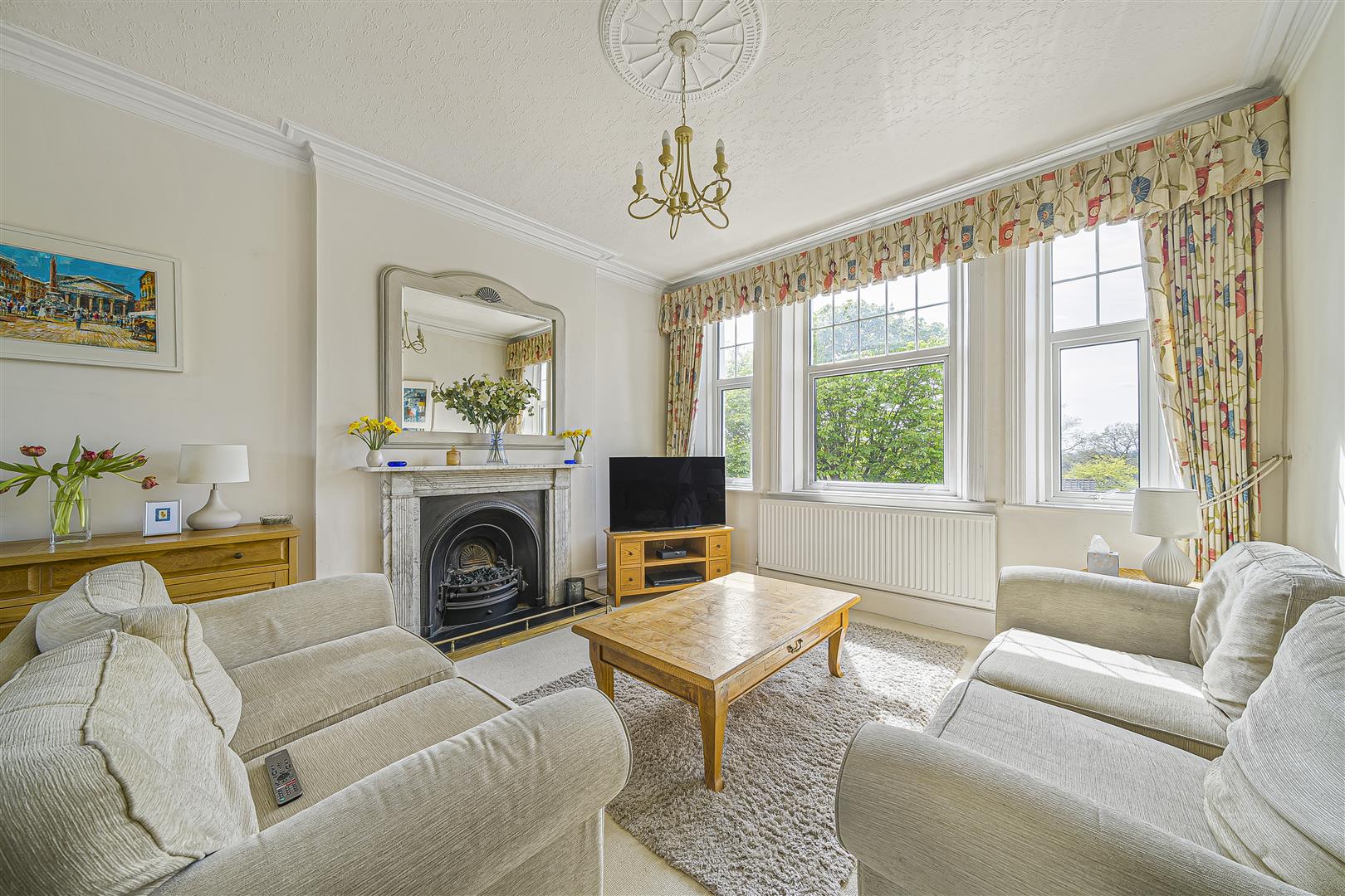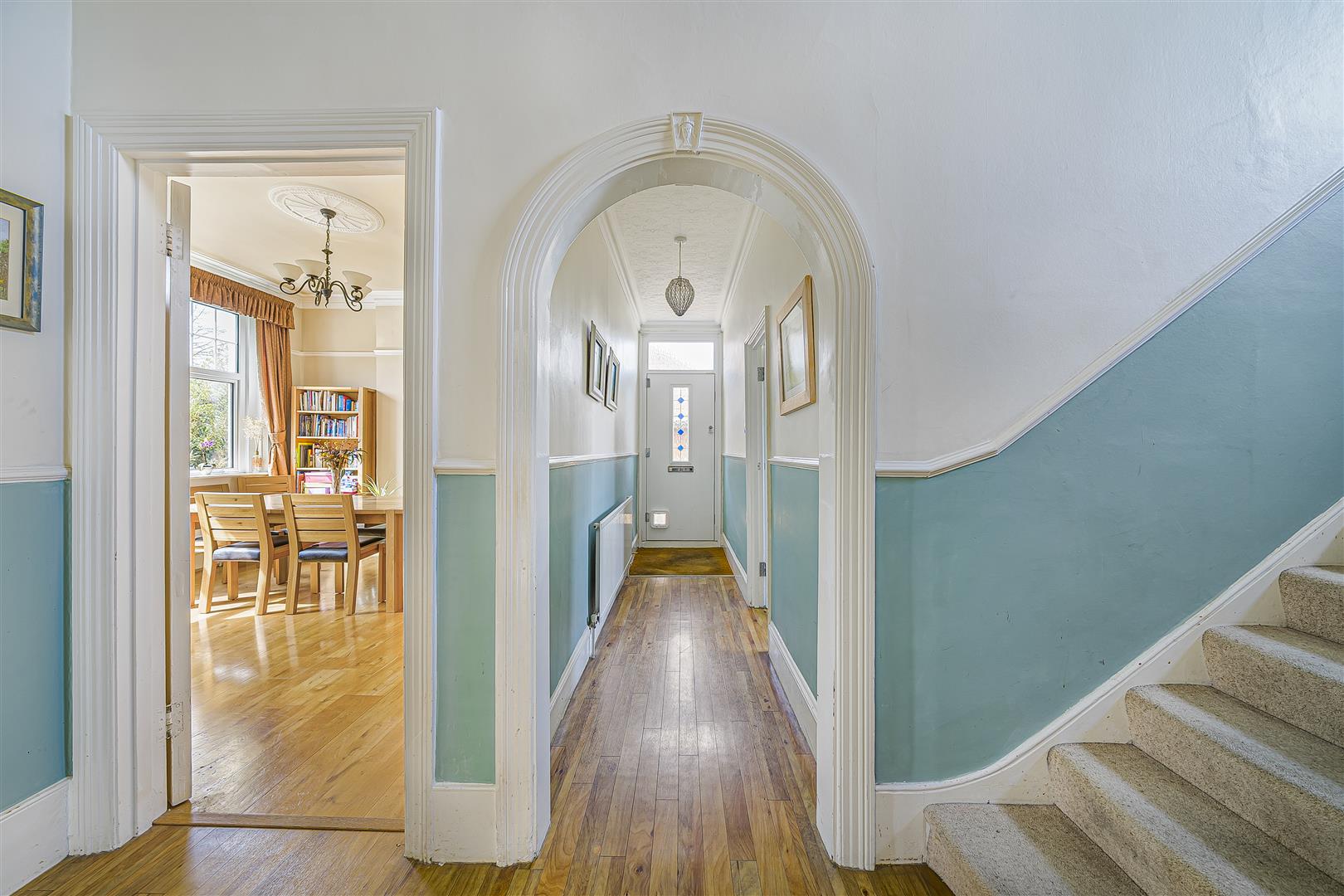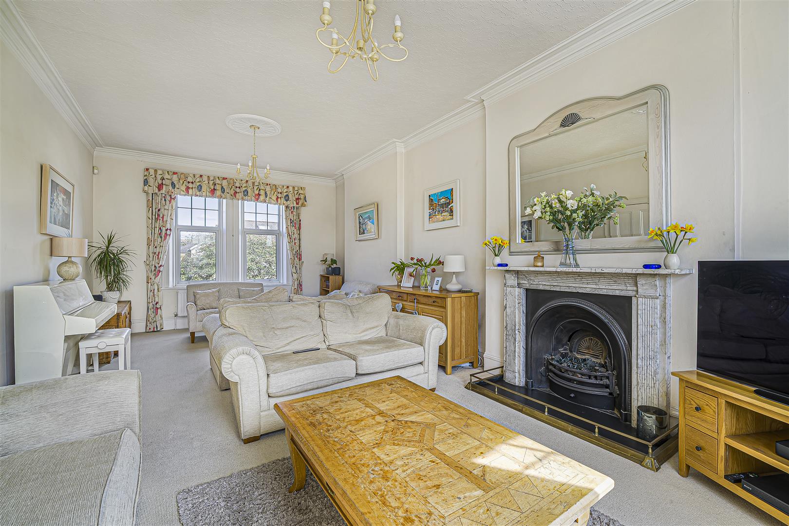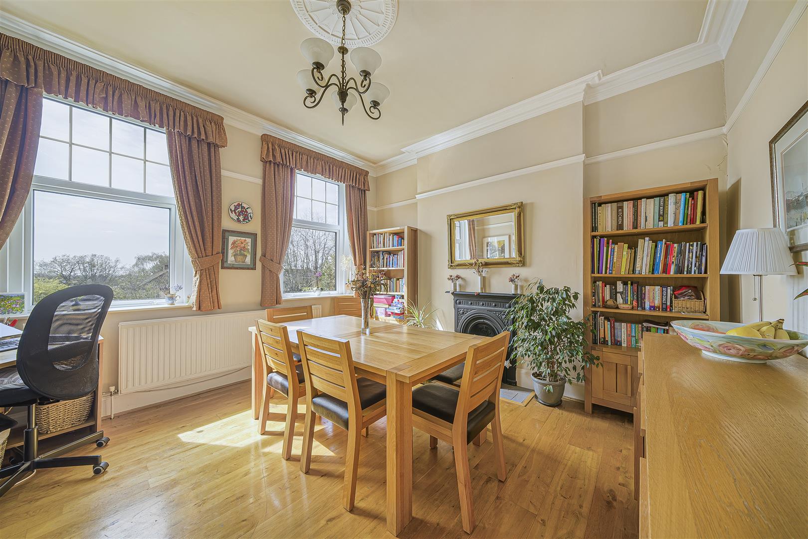 An impressive through living room featuring double glazed windows to both front and rear; feature period fireplace with marble surround and gas fire.DINING ROOM