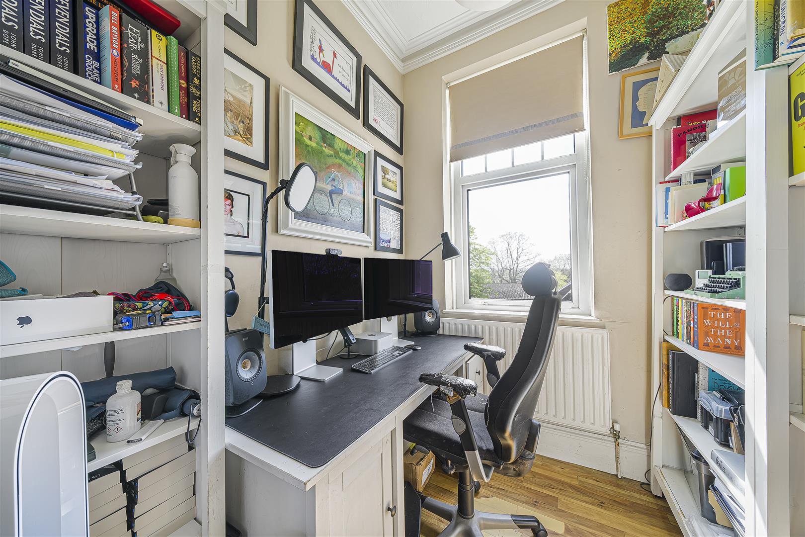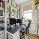 A beautifully appointed kitchen featuring a comprehensive range of stylish wall and base units with Quartz worktops; full range of integrated appliances; Amtico flooring; double glazed window to rear; cupboard housing gas boiler.STUDY