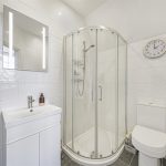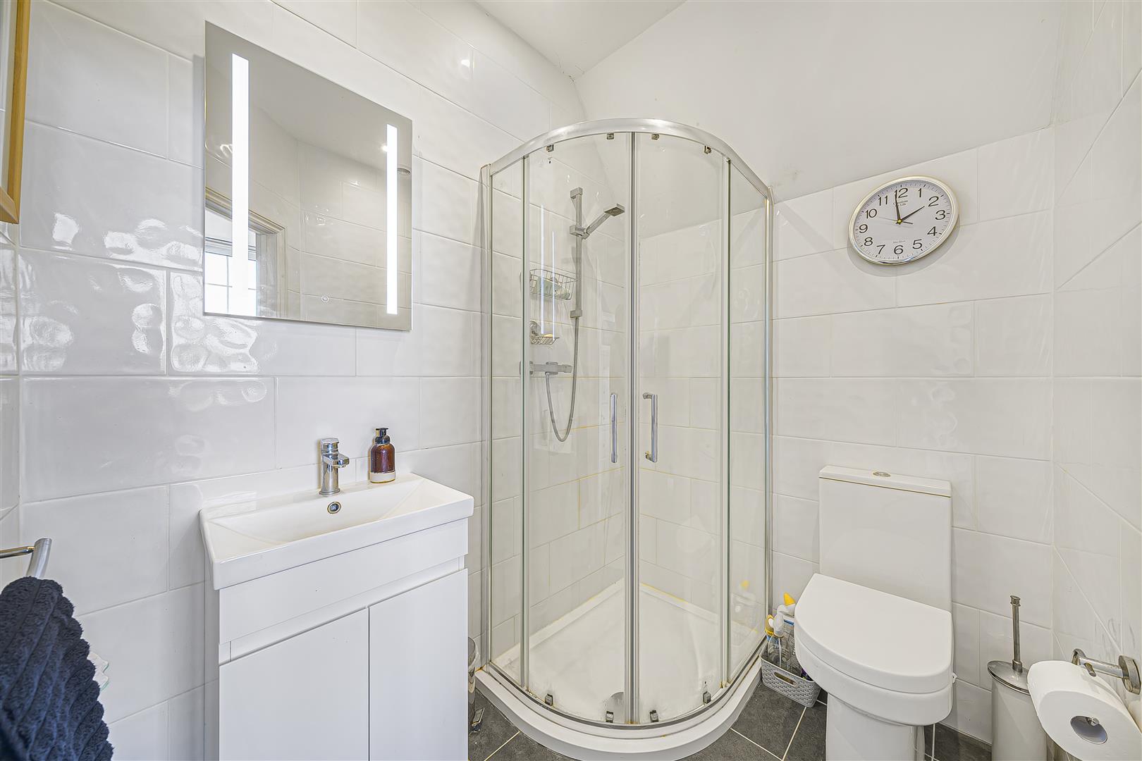 Suite comprising fitted corner shower enclosure; fitted wash basin; WC; fully tiled walls and flooring.BEDROOM 2