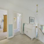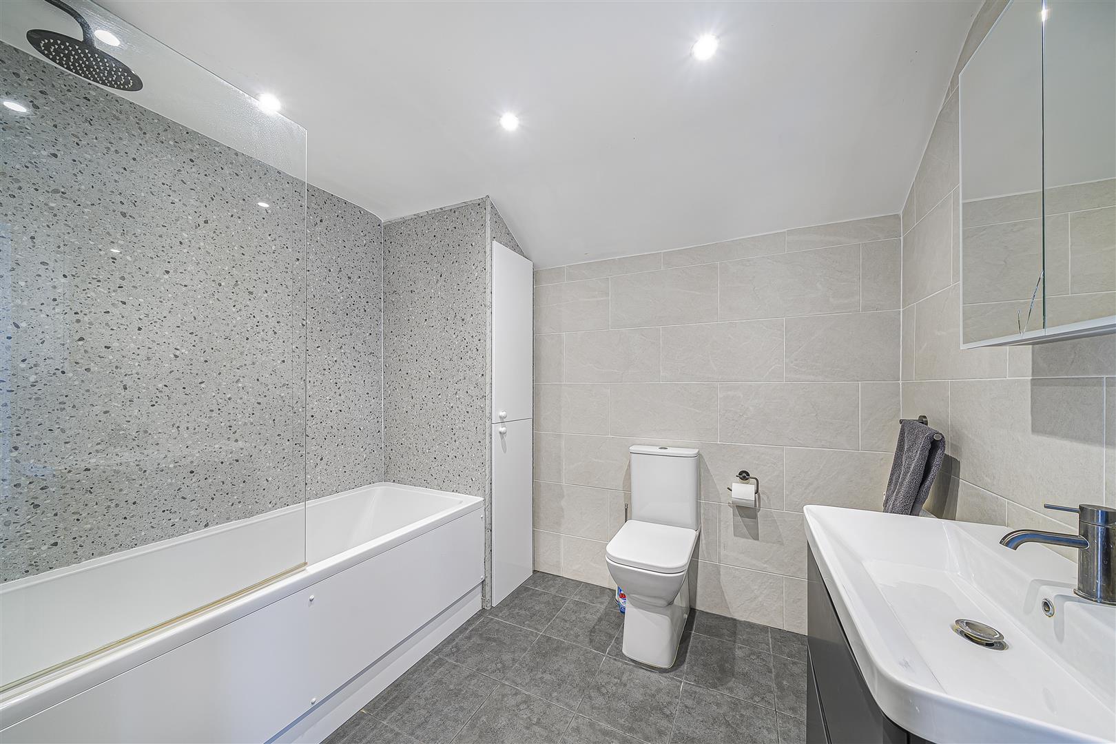 A luxuriously appointed bathroom featuring bath with built-in shower over and glass shower screen; over-sized wash basin; WC; fully tiled walls and tiled flooring with underfloor heating; heated towel rail; radiator; double glazed window to rear.TOP FLOOR LANDING