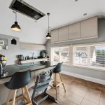Double glazed window to front. Kitchen fitted with modern and comprehensively appointed units with black granite worktops and central return breakfast bar housing hob. Featuring soft closing cupboards and drawers, a pull-out larder, high-end appliances comprising of oven, induction hob, microwave, wine chiller, dishwasher, boiling water tap and US style fridge/freezer (to remain). Tiled flooring with underfloor heating. Ceiling mounted remote-controlled extractor fan with lighting.