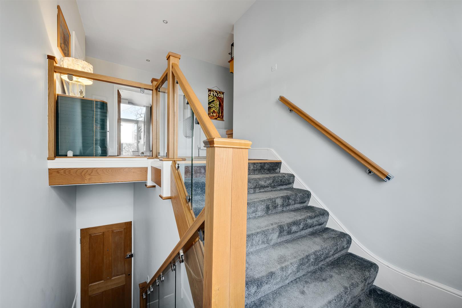 The property is accessed from the communal hallway on the first floor and features the original double height turning staircase to the top floor with glass balustrading. Double glazed window to rear.