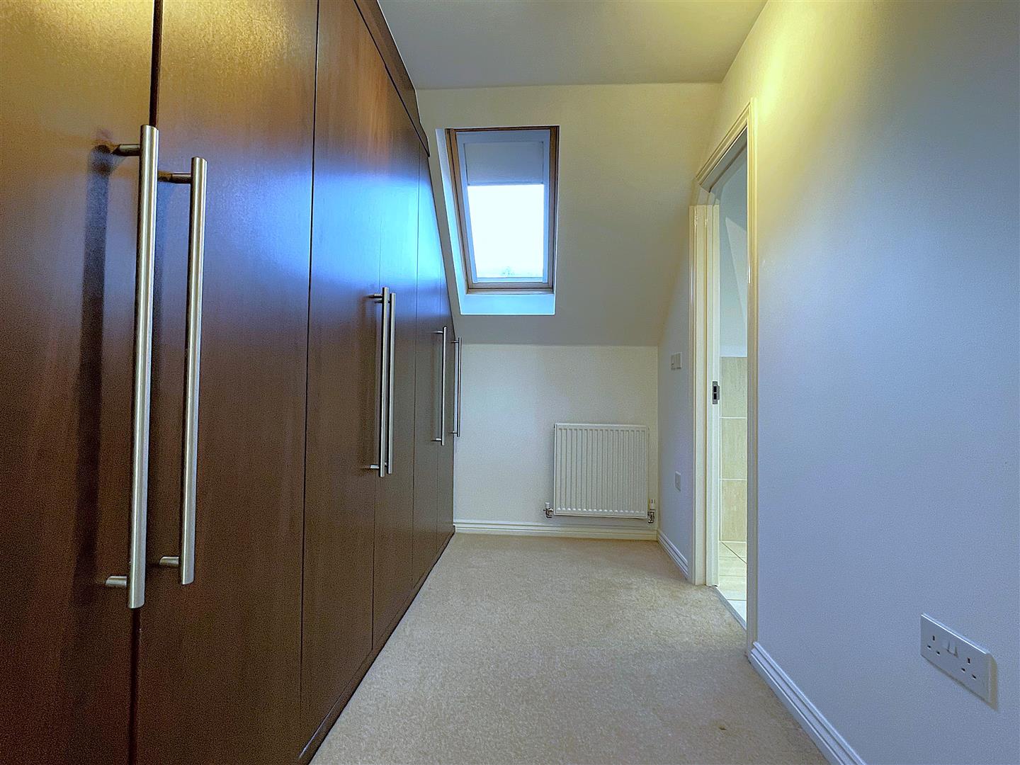Double glazed dormer window to front; built-in storage cupboard housing hot water cylinder; opening to dressing area with range of built-in wardrobes to one wall; skylight window to rear. Door to:EN SUITE SHOWER