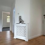 Part glazed original front door; deep built-in understairs storage cupboard with light; additional shelved storage cupboard; radiator with fitted cover; wood effect flooring.