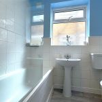 Double glazed window to side; suite comprising panelled bath with mixer tap/shower attachment and fitted glass shower screen; pedestal wash basin; WC; part tiled walls; vinyl flooring; heated towel rail.