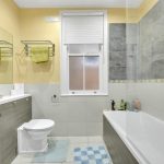 Sash window to side; suite comprising white bath with chrome fittings and a pull-out shower attachment; wood design vanity storage unit with integral W/C and hand basin; part tiled walls; tiled flooring.TOP FLOOR LANDING
