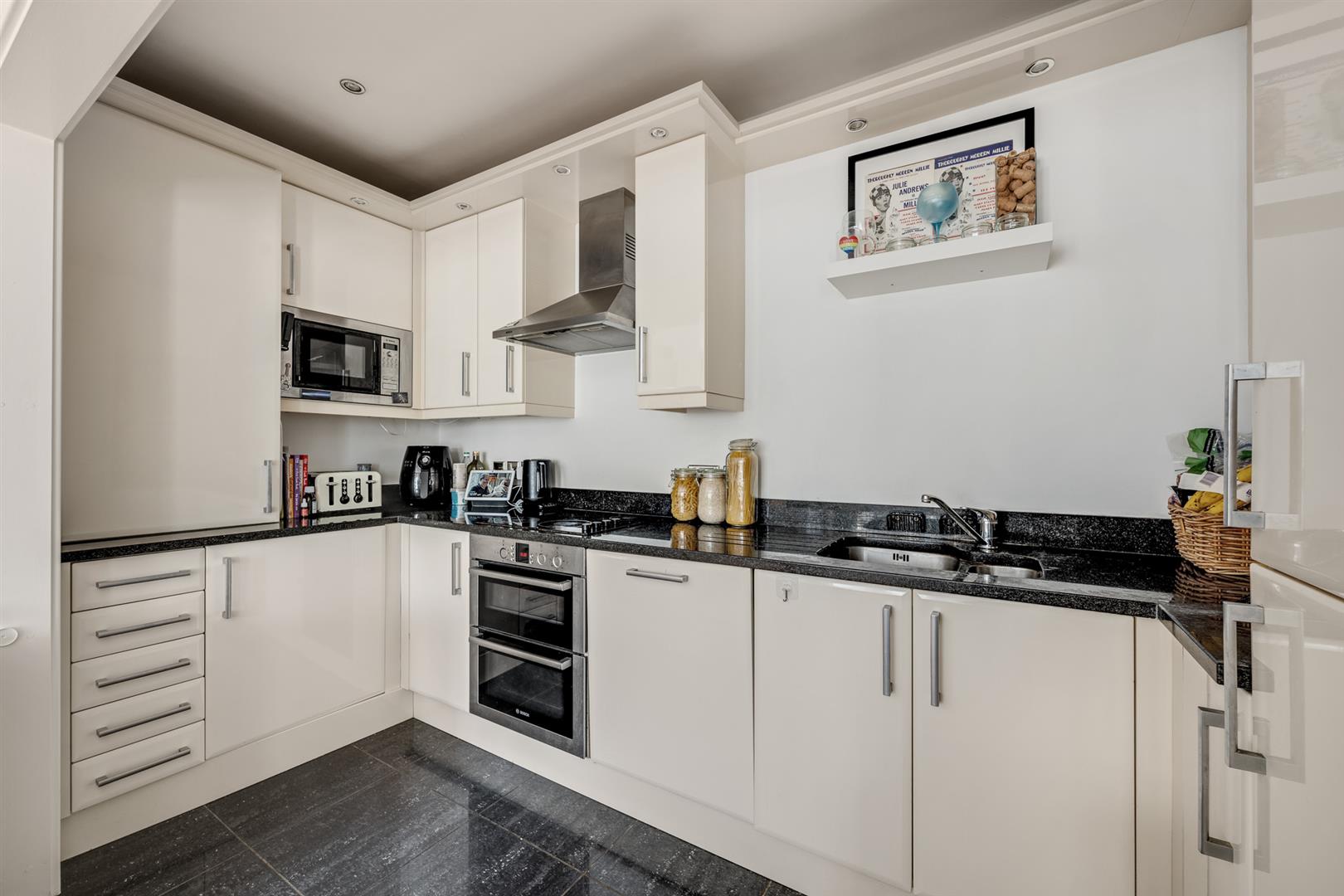 Fitted with a comprehensive range of modern wall and units with granite worktops; integrated appliances comprising - washing machine, dishwasher, fridge/freezer, microwave, coffee machine.BEDROOM 1