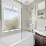 Double glazed window to rear; modern and well appointed suite comprising bath with built-in shower over; fitted wash basin with vanity storage under; heated towel rail; fully tiled walls.SEPARATE WC