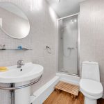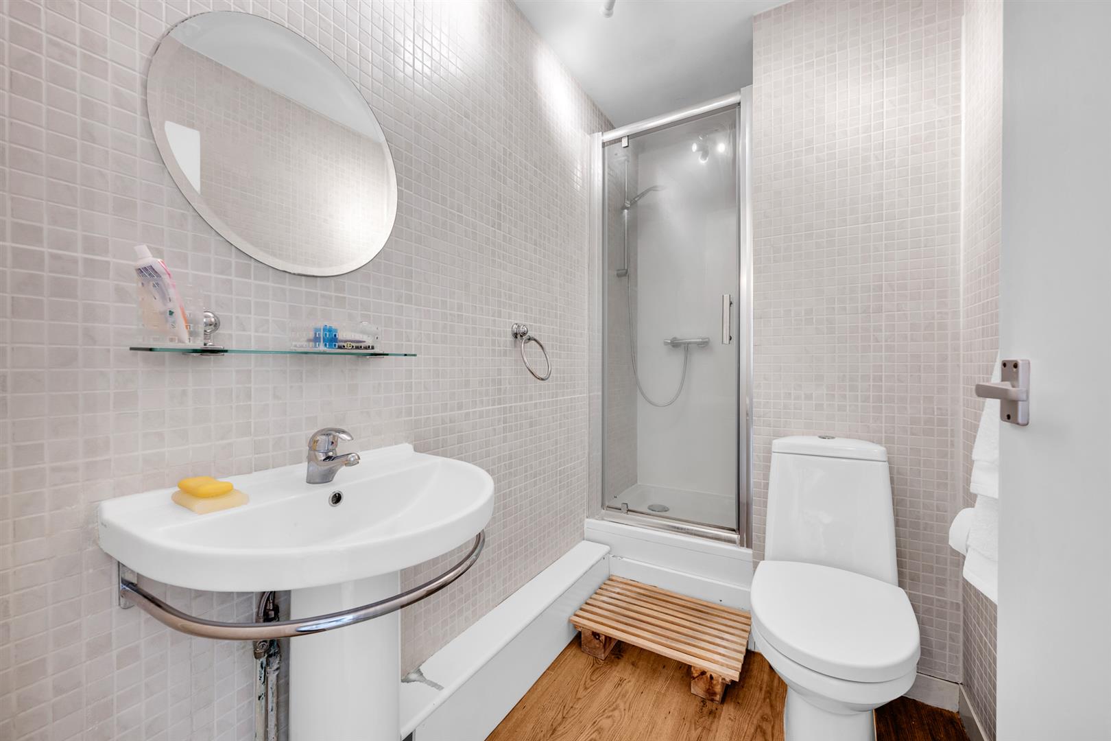 Modern suite comprising full width shower cubicle; pedestal wash basin; WC; fully tiled walls; heated towel rail.PARKING